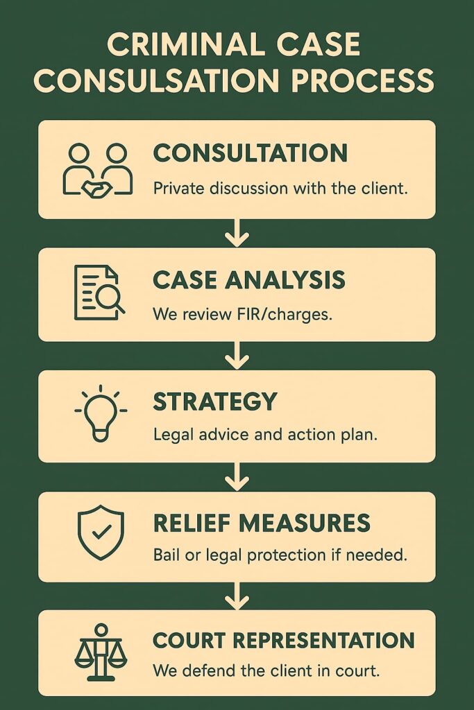 Navigating a criminal case can be overwhelming—but you’re not alone. Our structured approach ensures every step is handled with expertise and care. From the initial consultation to courtroom representation, we provide clear legal guidance, evaluate charges, prepare strategy, and seek relief measures like bail when necessary. Your defense begins with a conversation.